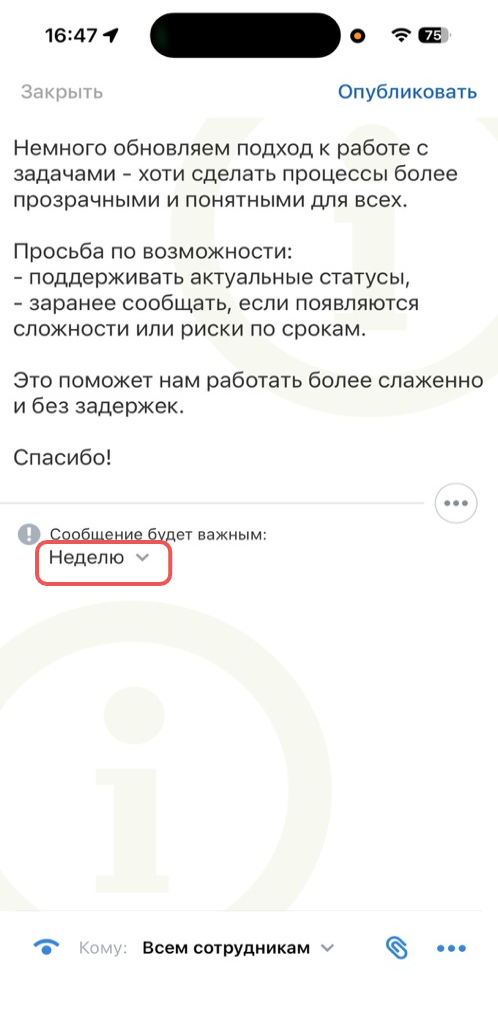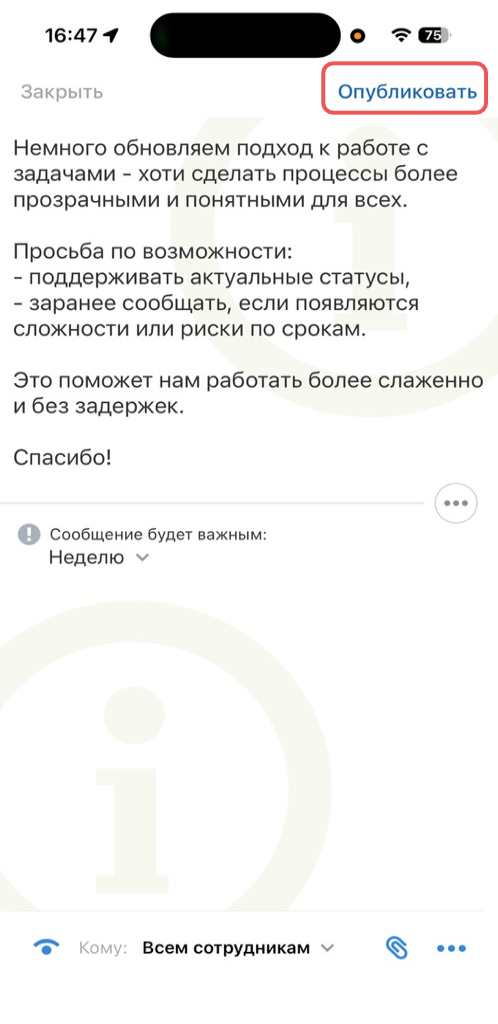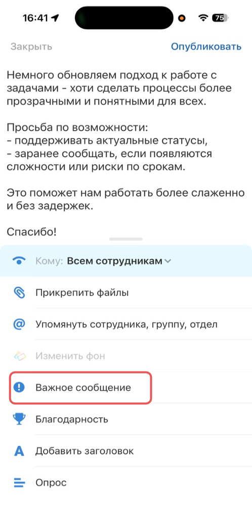 В процессе работы часто нужно донести информацию до всех сотрудников и убедиться, что каждый ее прочитал. Например, компания индексирует зарплаты и всем нужно прийти в бухгалтерию подписать новый договор. Для таких случаев в Ленте есть важное сообщение — оно покажет, кто уже ознакомился с информацией, а кто еще нет.