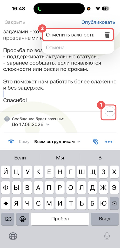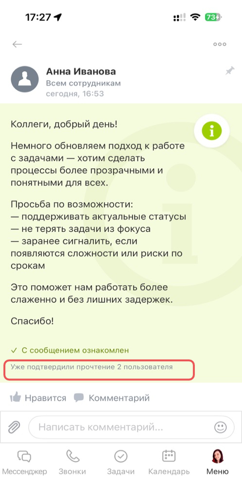 В Ленте можно посмотреть, кто из сотрудников уже прочитал важное сообщение и подтвердил это. Под ним отображается надпись — Уже подтвердили прочтение N пользователей.