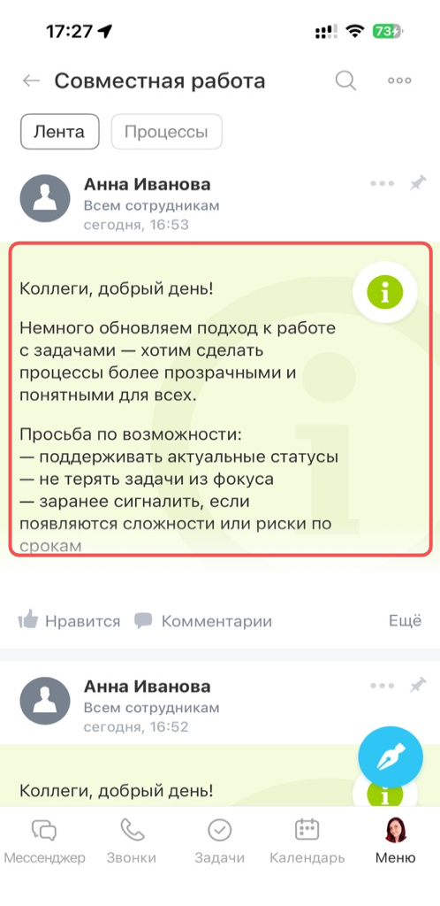 Важное сообщение в Ленте отмечено цветом и значком i, чтобы его можно было отличить от остальных.