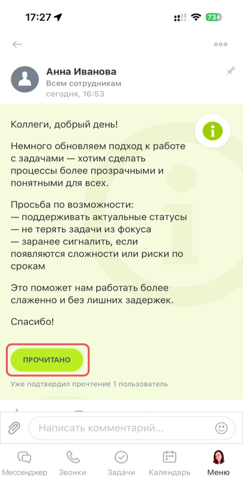 Нажмите на сообщение — оно откроется полностью и под ним появится кнопка Прочитано. Нажмите ее, чтобы подтвердить, что ознакомились с информацией. После этого под сообщением появится пометка С сообщением ознакомлен.