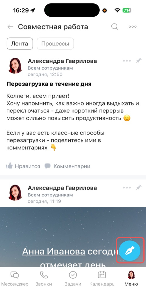 Нажмите Опубликовать. После публикации сообщение появится в Ленте.