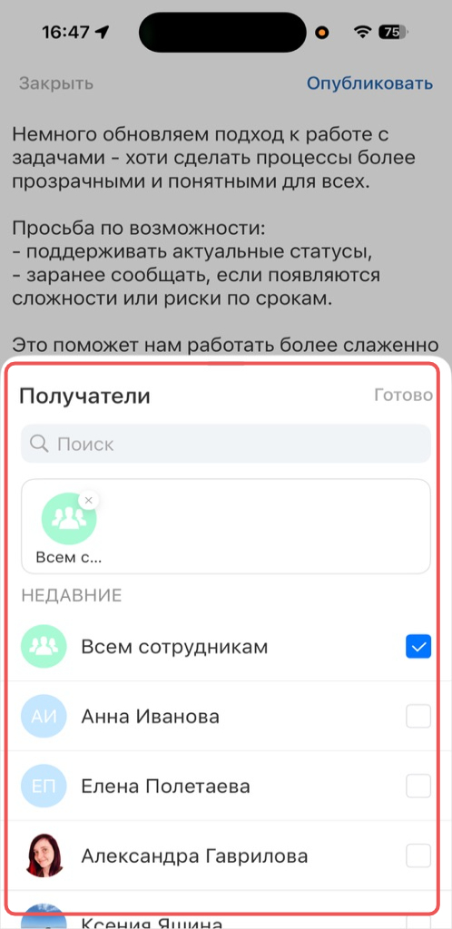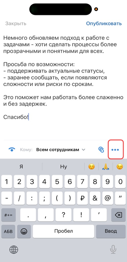 Выберите сотрудников, которые увидят сообщение: нажмите на поле Кому под текстом поста.