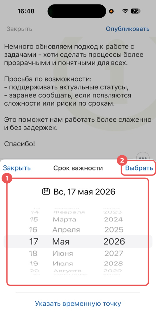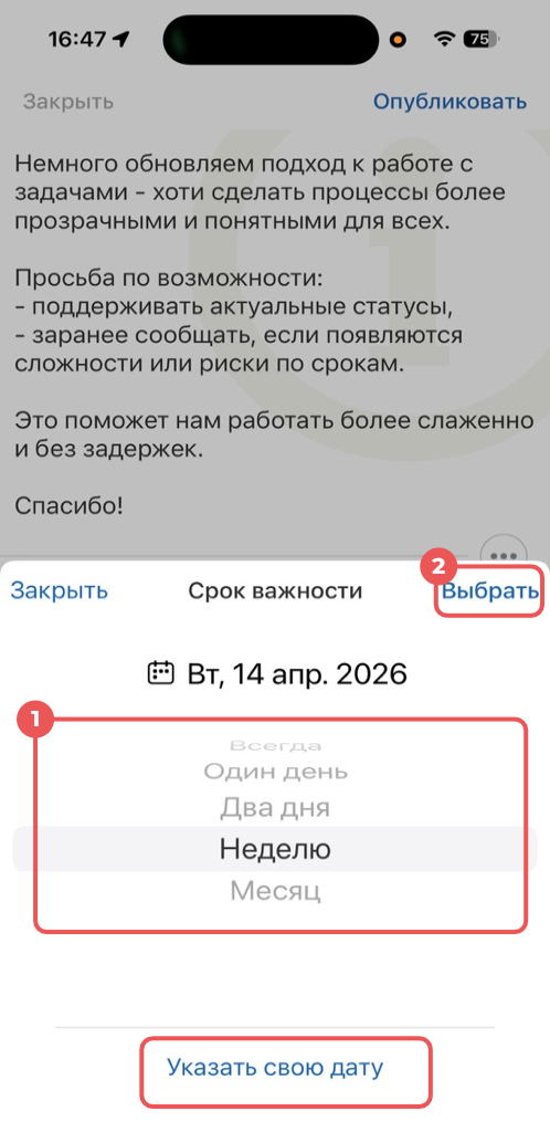 Укажите срок важности — по умолчанию сообщение считается важным неделю. Если этот срок не подходит, нажмите на надпись Неделю.