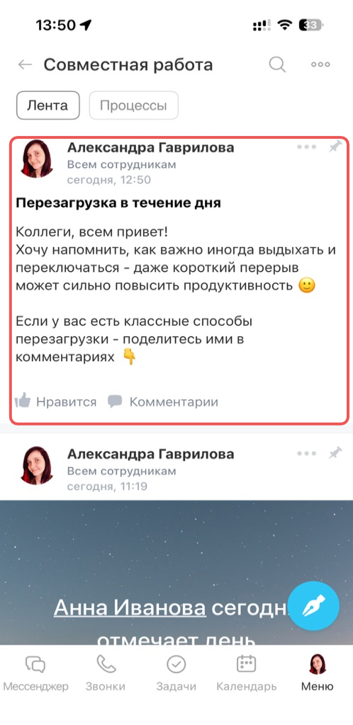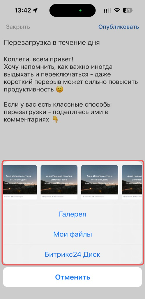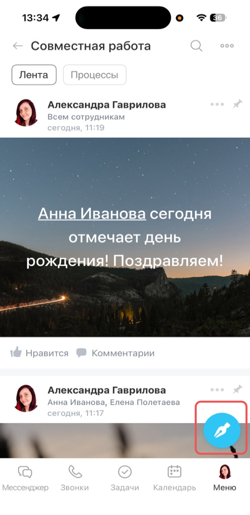 Лента — это раздел Битрикс24, где можно делиться новостями, объявлениями и важной информацией с коллегами. В мобильном приложении сообщение в Ленту можно написать и опубликовать в несколько шагов.