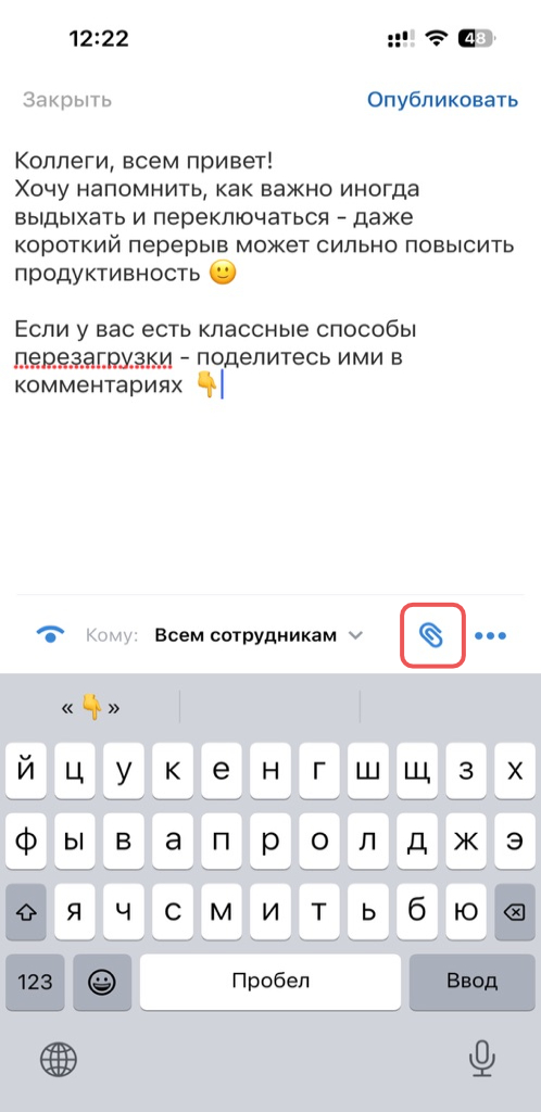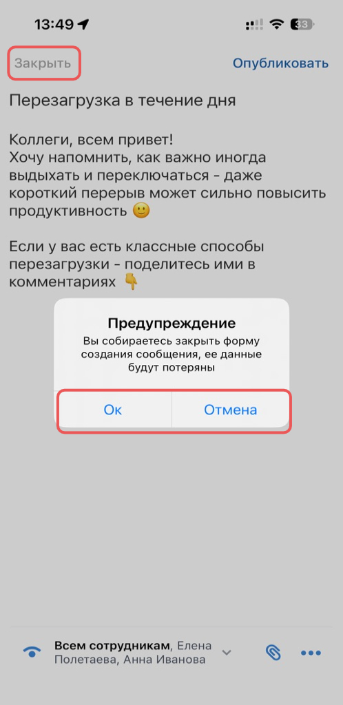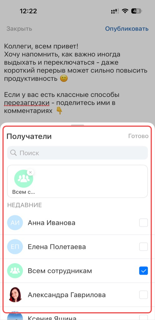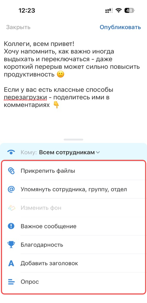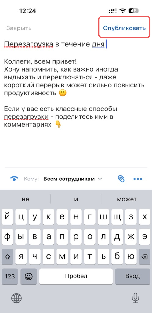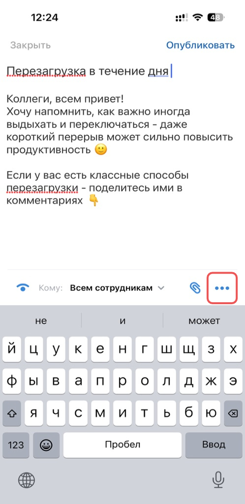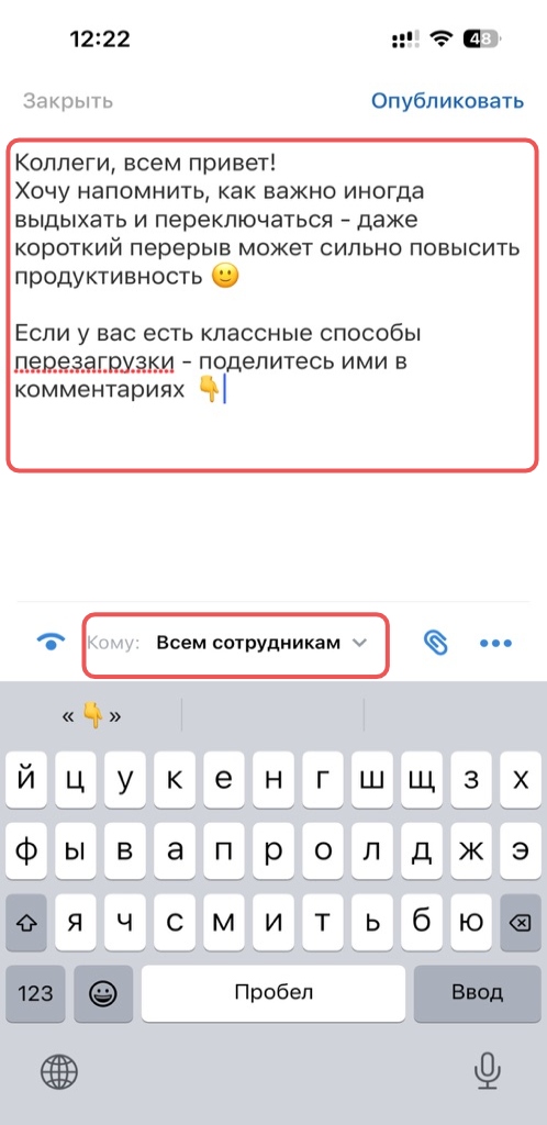 Введите текст сообщения в поле для ввода. Чтобы выбрать, кто увидит сообщение, нажмите на поле Кому в нижней части экрана — по умолчанию там стоит Всем сотрудникам.