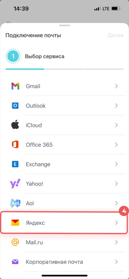 4. Выберите почтовый сервис, который хотите подключить. Например, Яндекс или Mail.ru.