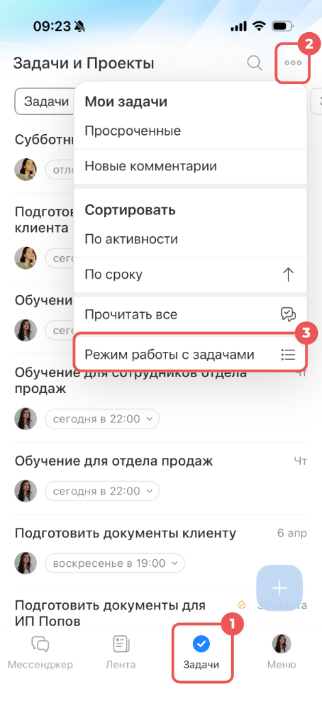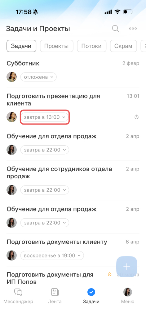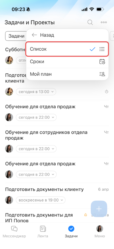 В режиме Список все задачи отображаются с ключевыми параметрами: названием, сроками и активностью. Это удобно, когда нужно быстро найти задачу, отсортировать список или выполнить действие, не открывая задачу.
