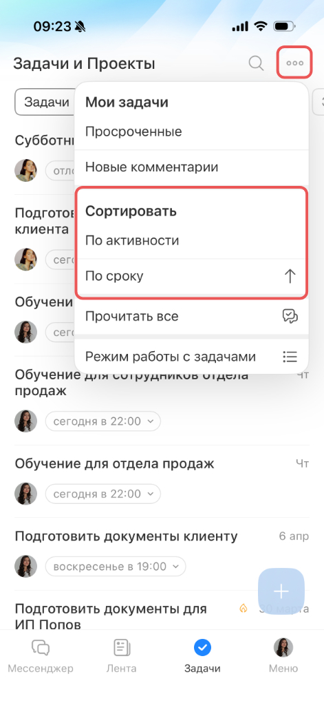 По умолчанию задачи отсортированы по активности: вверху те, в которых были последние изменения. Чтобы изменить порядок, нажмите Три точки (...) и выберите По сроку.