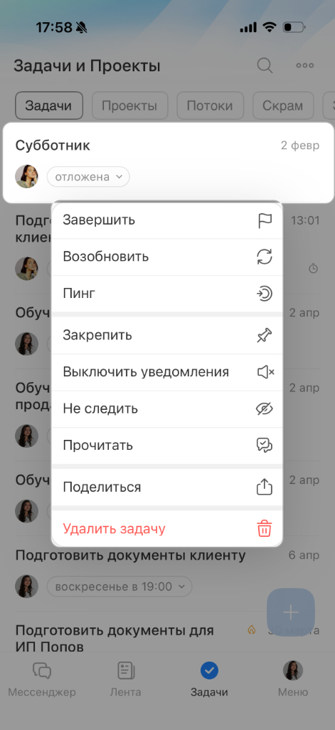 Нажмите и удерживайте задачу — откроется меню действий. Выберите нужное.