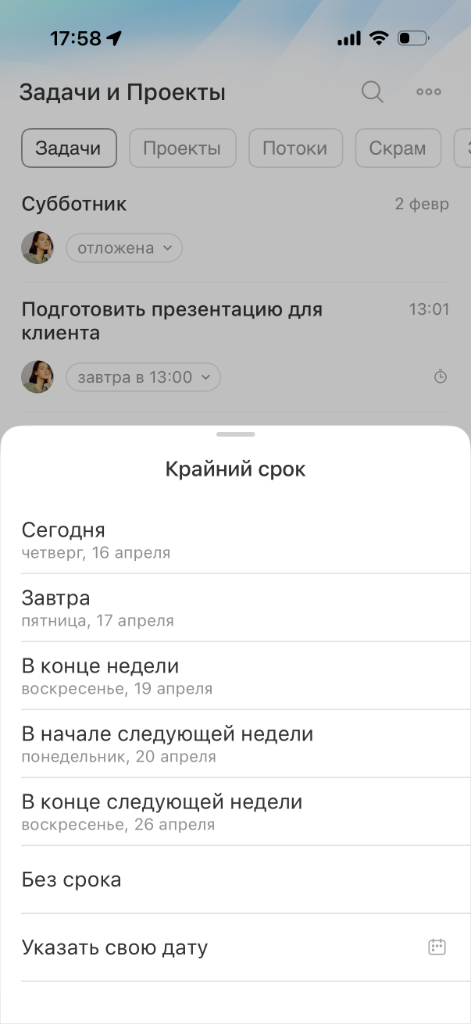 Чтобы изменить крайний срок не открывая задачу, нажмите на дату.
