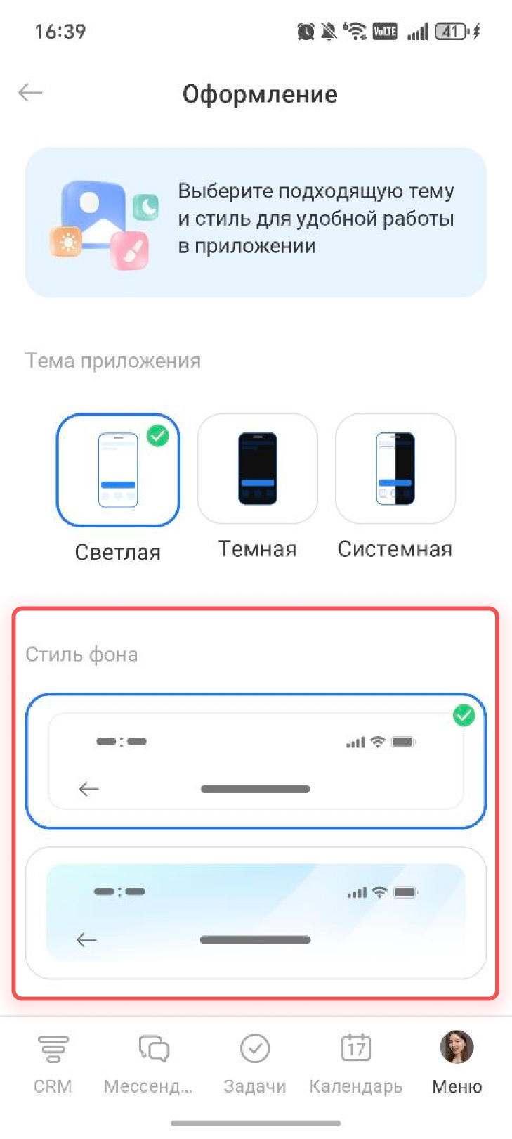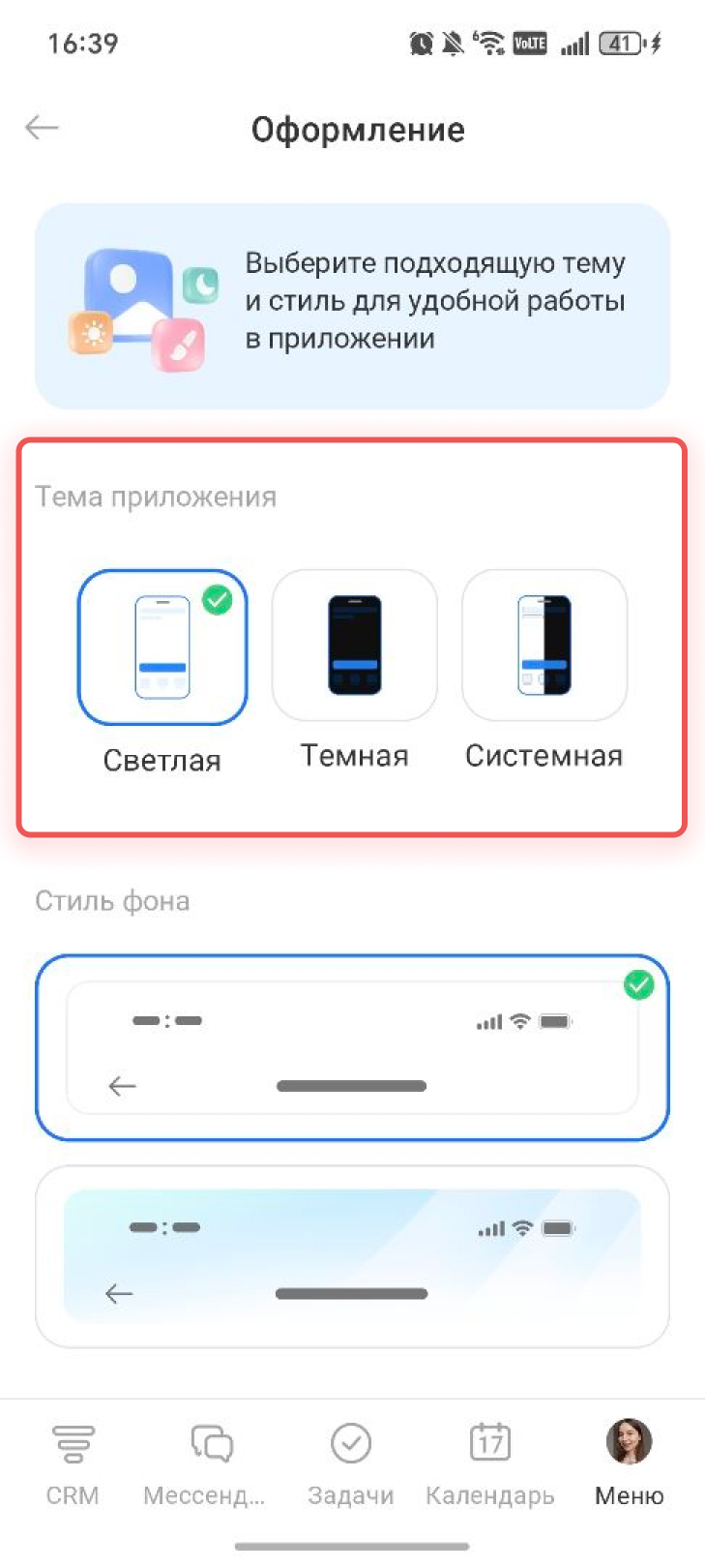 Оформление мобильного приложения Битрикс24 можно настроить под себя: выбрать светлую, темную или системную тему, а также цвет фона. Например, установите системную тему, чтобы приложение автоматически подстраивалось под настройки телефона.