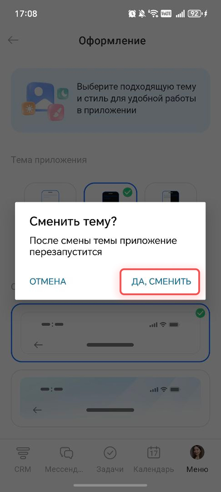 Нажмите Да, сменить, чтобы подтвердить смену темы. После этого приложение перезапустится.