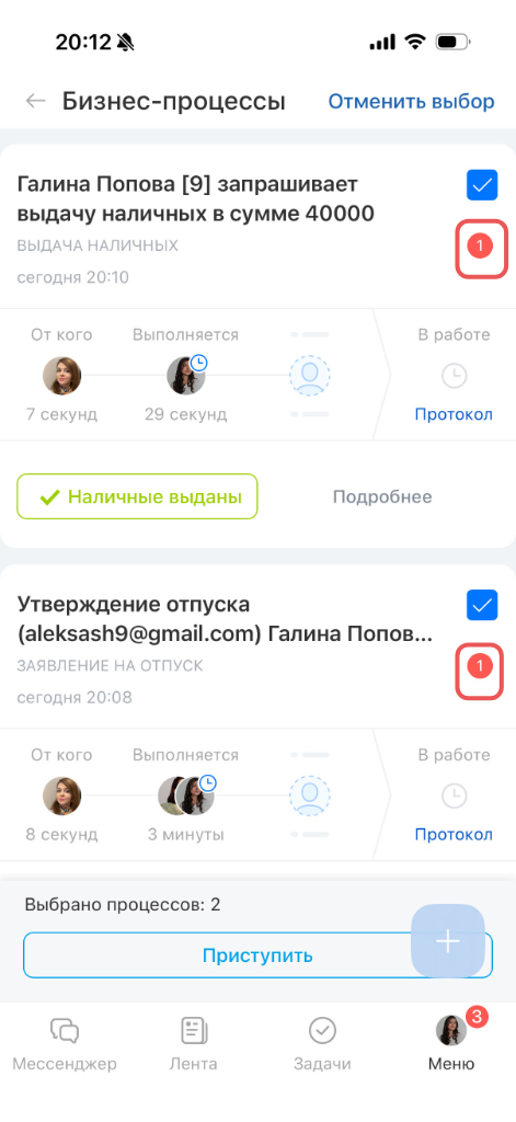 Здесь отображаются все процессы с участием: запущенные самостоятельно и те, по которым нужно выполнить задание. Когда появляются новые задания — загорается счетчик с общим количеством заданий.