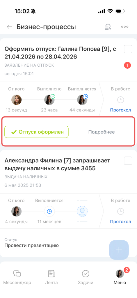 Когда в компании запускают бизнес-процесс, его участники получают задания. Например утвердить закупку, ознакомиться с документом или согласовать отпуск. Выполнить задание можно прямо в мобильном приложении.