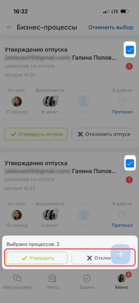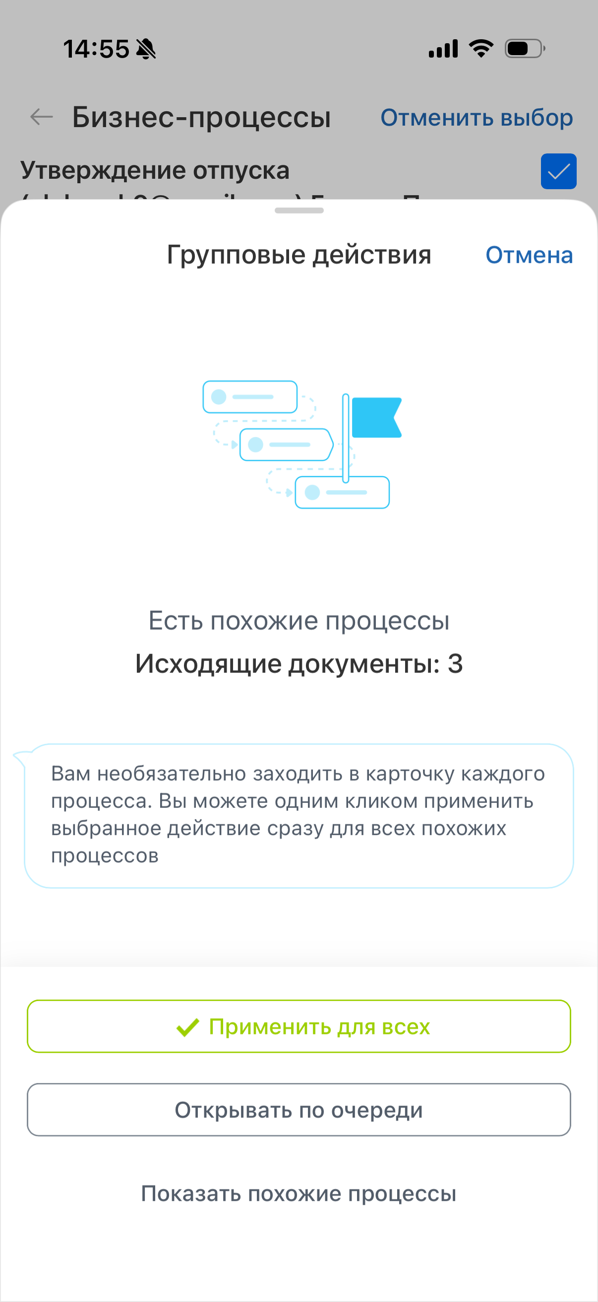 Задания одного типа — например, только утвердить или только ознакомиться. Действие применится ко всем выбранным процессам сразу.