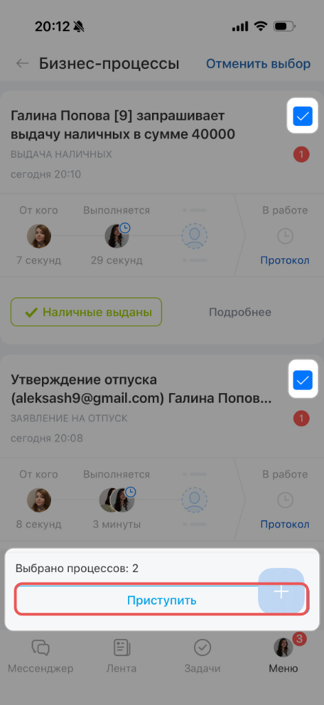 Задания разных типов — например, утвердить отпуск и одобрить оплату счета. Нажмите Приступить. Процессы откроются по очереди.