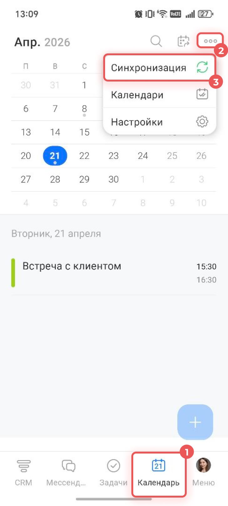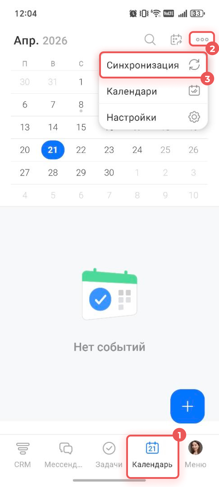Перейдите в раздел Календарь — его можно найти на нижней панели приложения или в разделе Меню. Нажмите на Три точки (...) в правом верхнем углу и выберите Синхронизация.