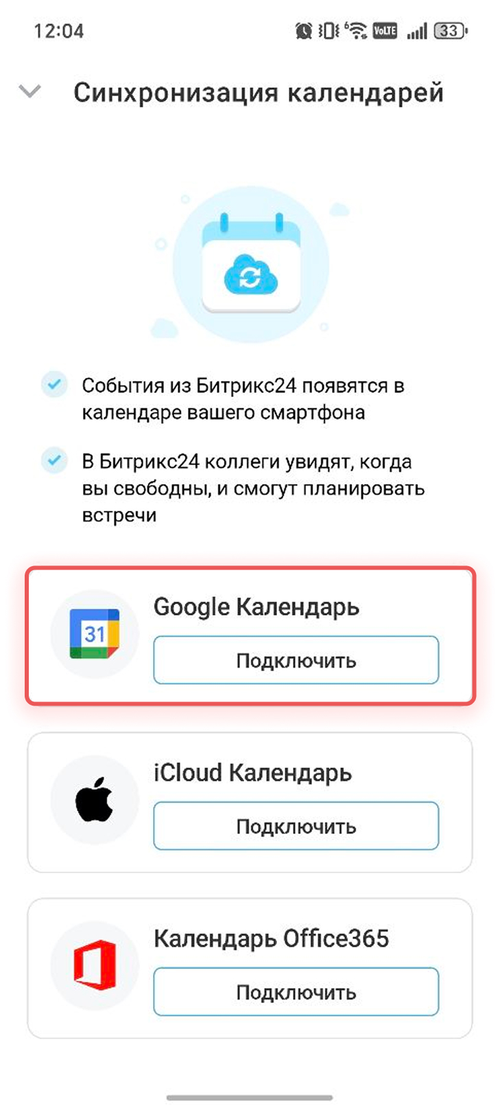 Нажмите Подключить рядом с пунктом Google Календарь.