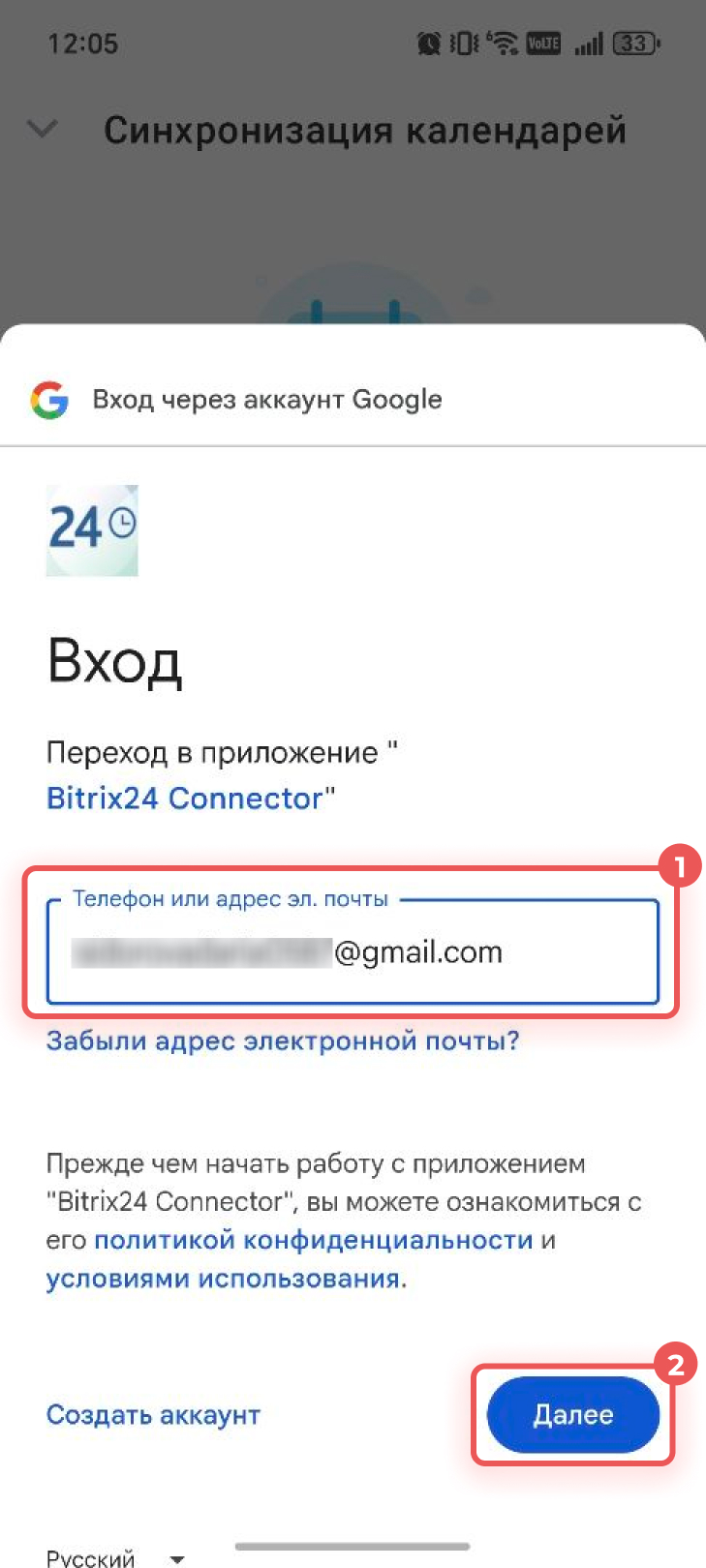 Войдите в аккаунт Google или выберите один из аккаунтов, добавленных на устройство. Нажмите кнопку Далее. Следуйте инструкциям на экране: войдите в приложение Bitrix24 Connector и предоставьте права доступа к аккаунту Google.