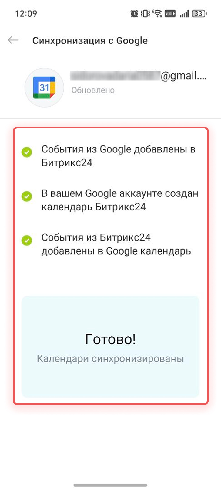Дождитесь, пока завершится синхронизация. После этого события из Google появятся в Битрикс24, а события из Битрикс24 — в Google. В аккаунте Google будет создан календарь Битрикс24 с рабочими событиями.