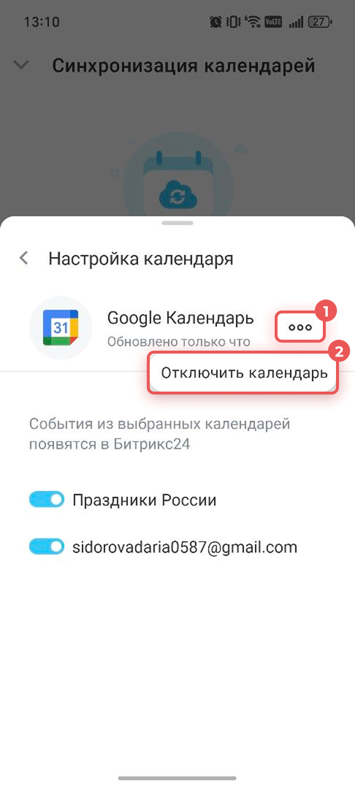 События из Google перестанут отображаться в Битрикс24. В аккаунте Google останется календарь Битрикс24, созданный при синхронизации. Его можно удалить вручную — это не повлияет на данные в Битрикс24.