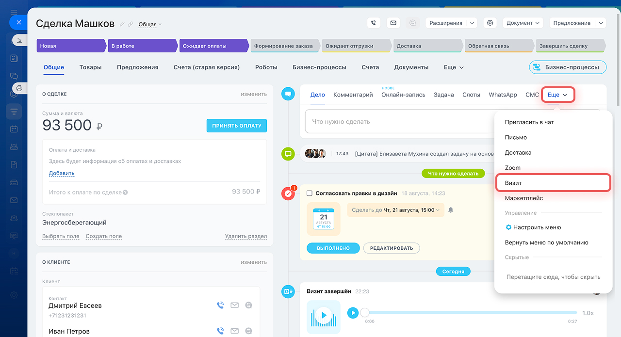 Перейдите в карточку сделки или лида, над таймлайном нажмите на дело Визит.