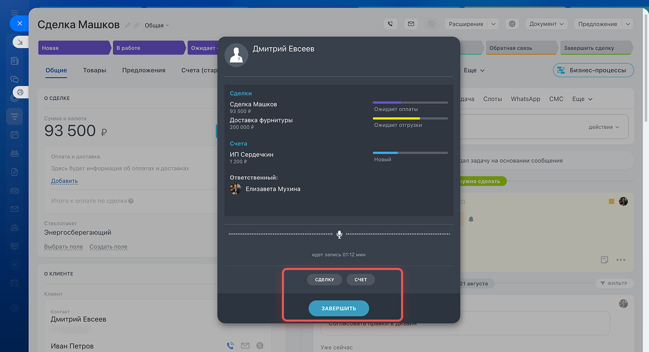 В окне трекера вы увидите таймер записи, сможете создать новую сделку или счёт.
