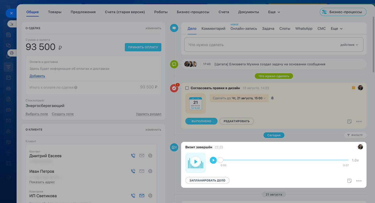 Визит-трекер - это инструмент для записи переговоров с клиентом. Он работает как диктофон, встроенный в CRM. Главный плюс в том, что запись встречи автоматически сохраняется в карточке сделки или лида.