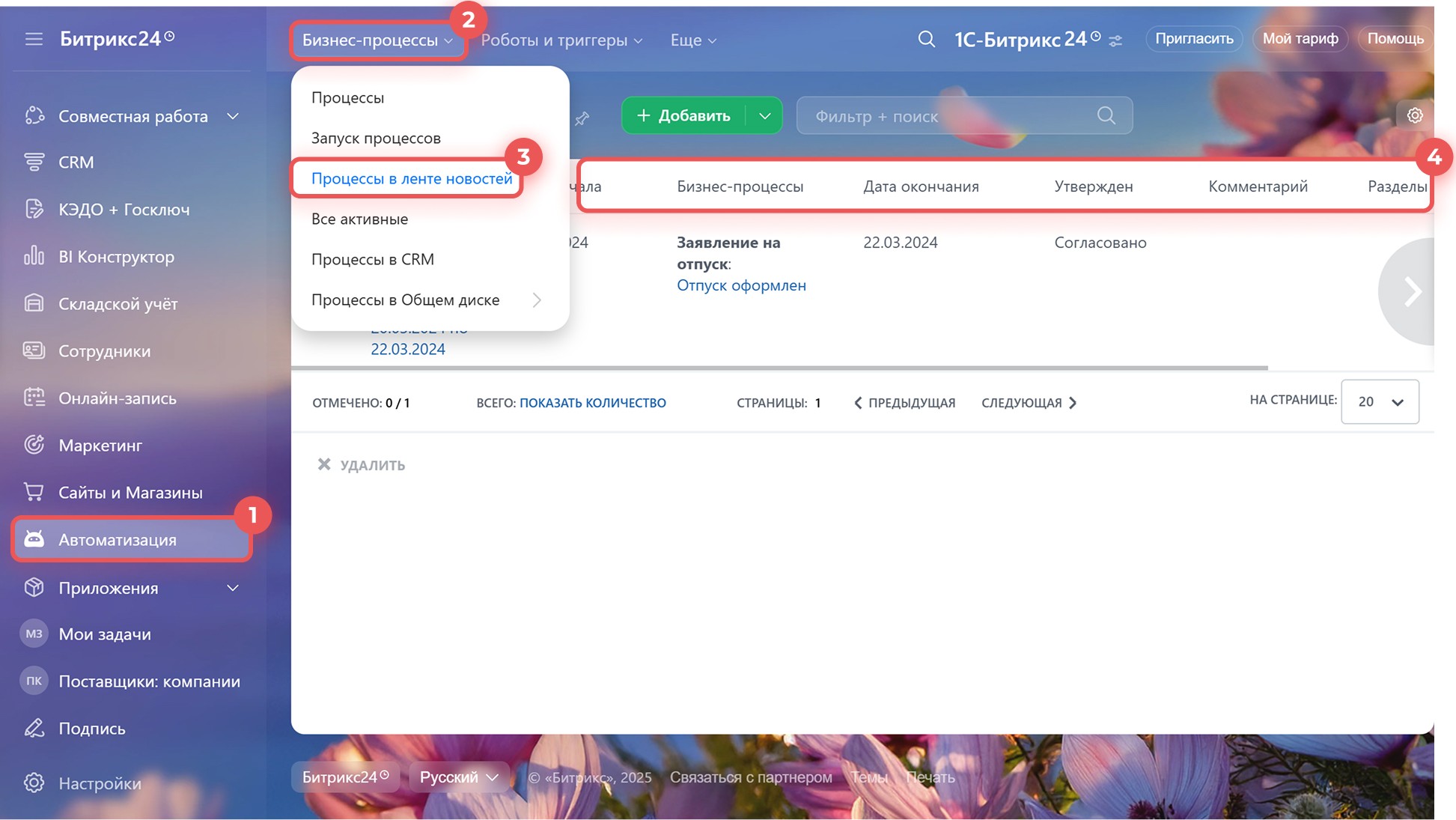 - Бизнес-процессы - переход к редактированию шаблонов бизнес-процессов. Будьте внимательны, это требует определенных знаний и квалификации.