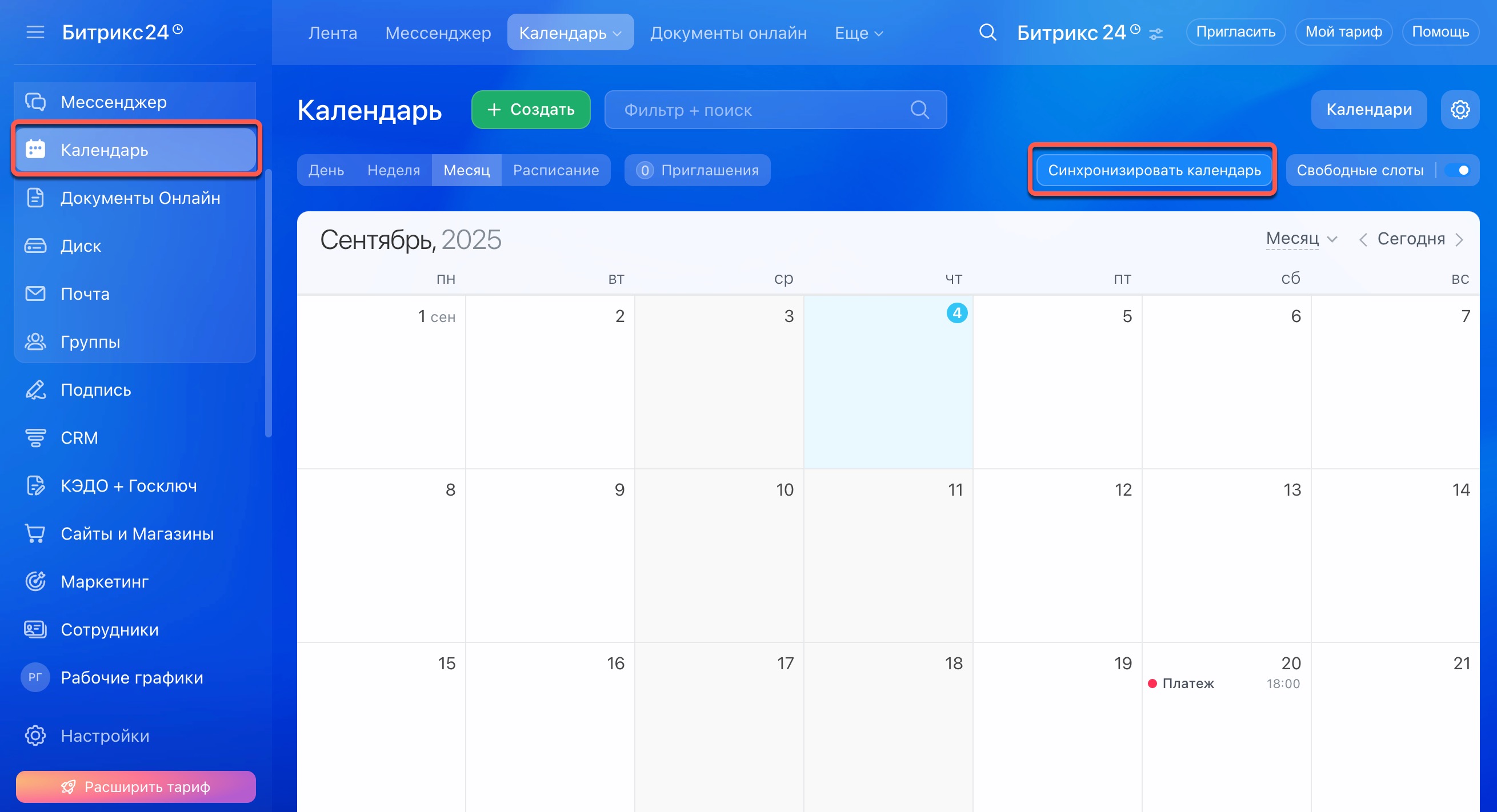 Откройте раздел Календарь и нажмите на кнопку Синхронизировать календарь: