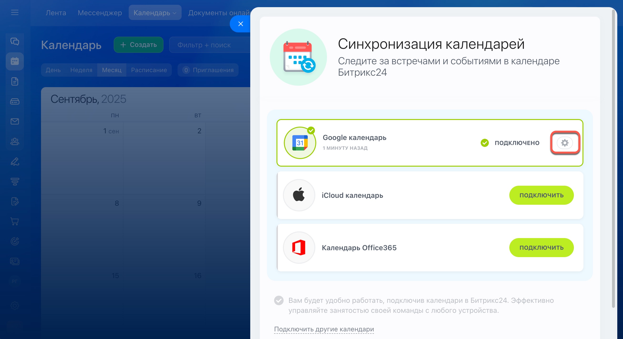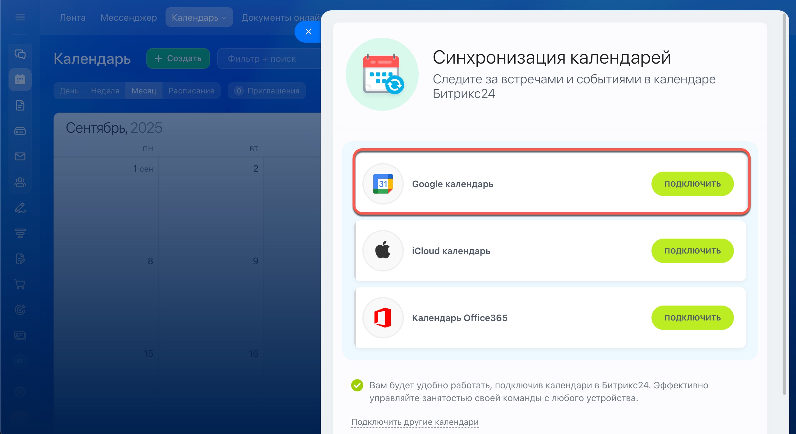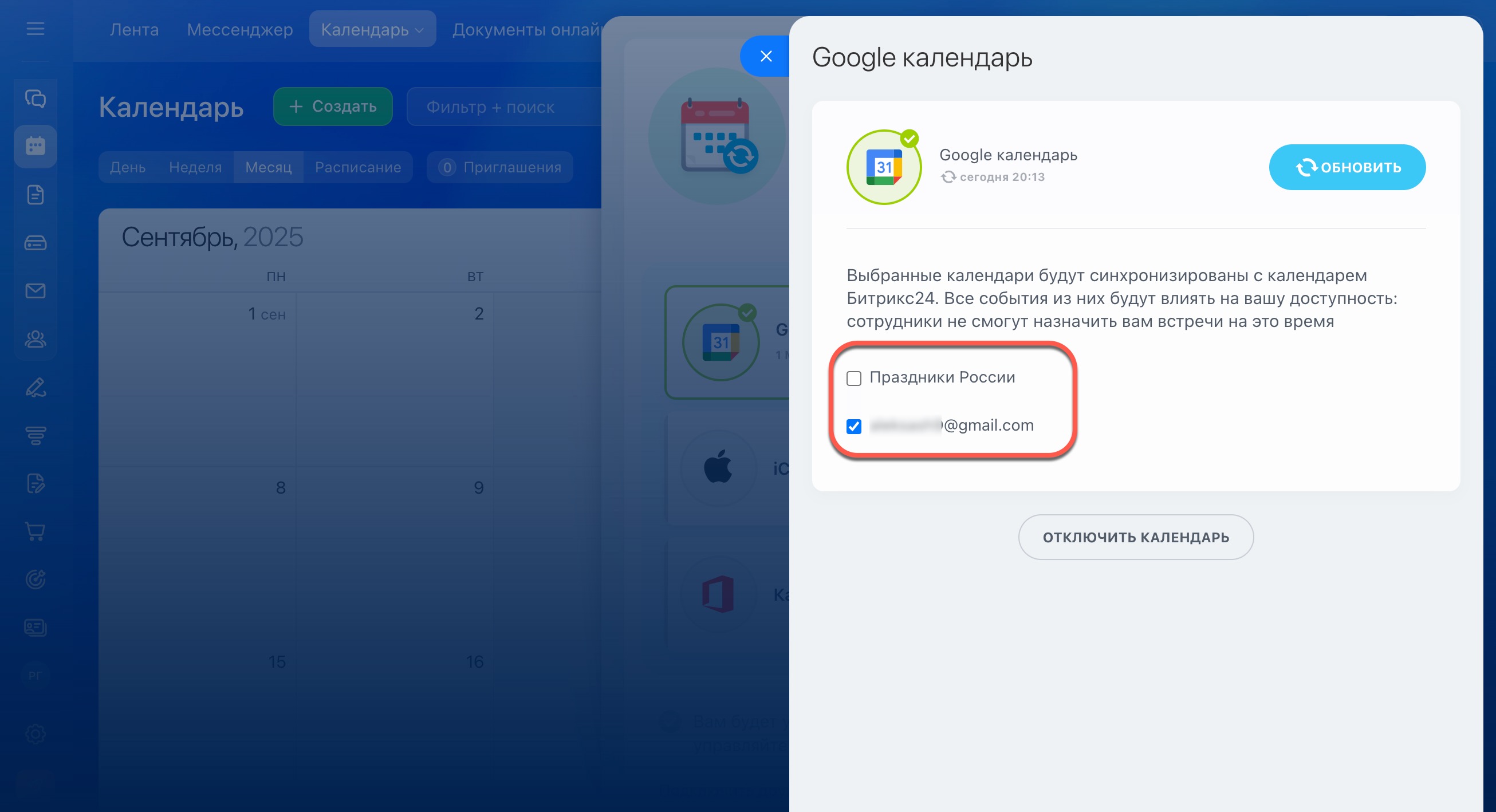 Затем выберите те календари Google, которые вы хотите синхронизировать с Битрикс24.