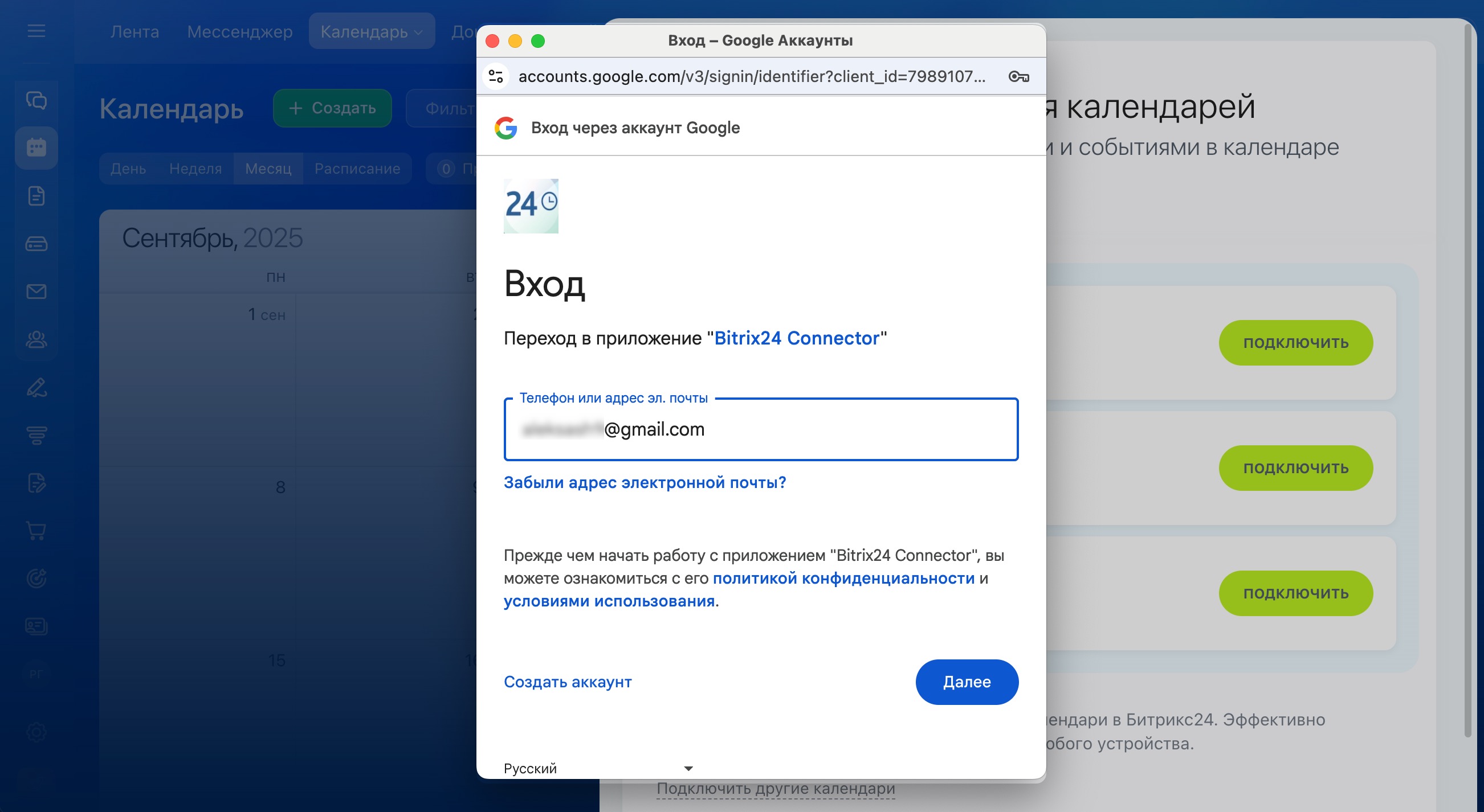 Авторизуйтесь или выберите подходящий аккаунт Google и разрешите доступ приложению Bitrix24 Connector к вашему календарю Google: