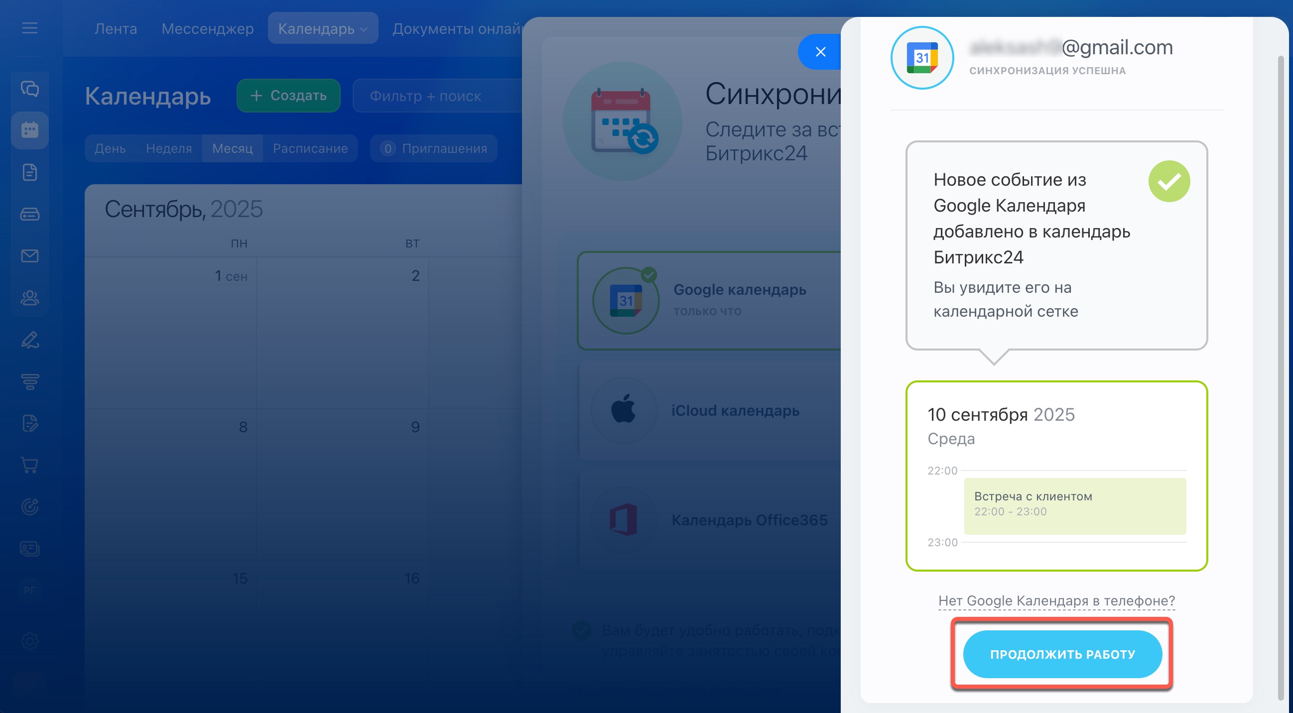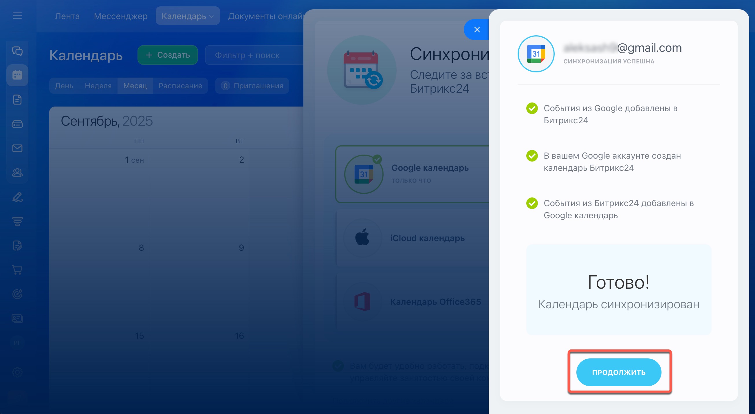 Когда календарь Битрикс24 синхронизирован с календарем Google, нажмите Продолжить:
