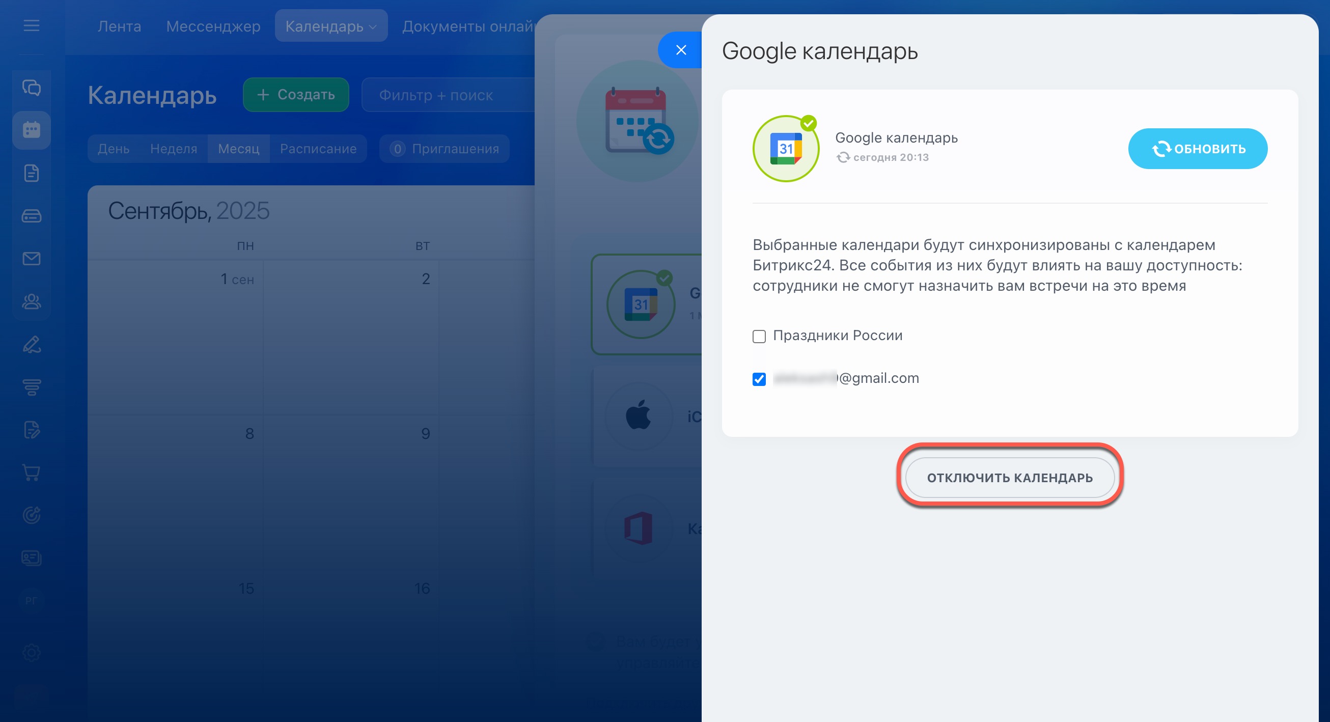 В Битрикс24 по умолчанию подключаются все календари учетной записи Google. Вы можете настроить выборочную синхронизацию отдельных календарей Google.