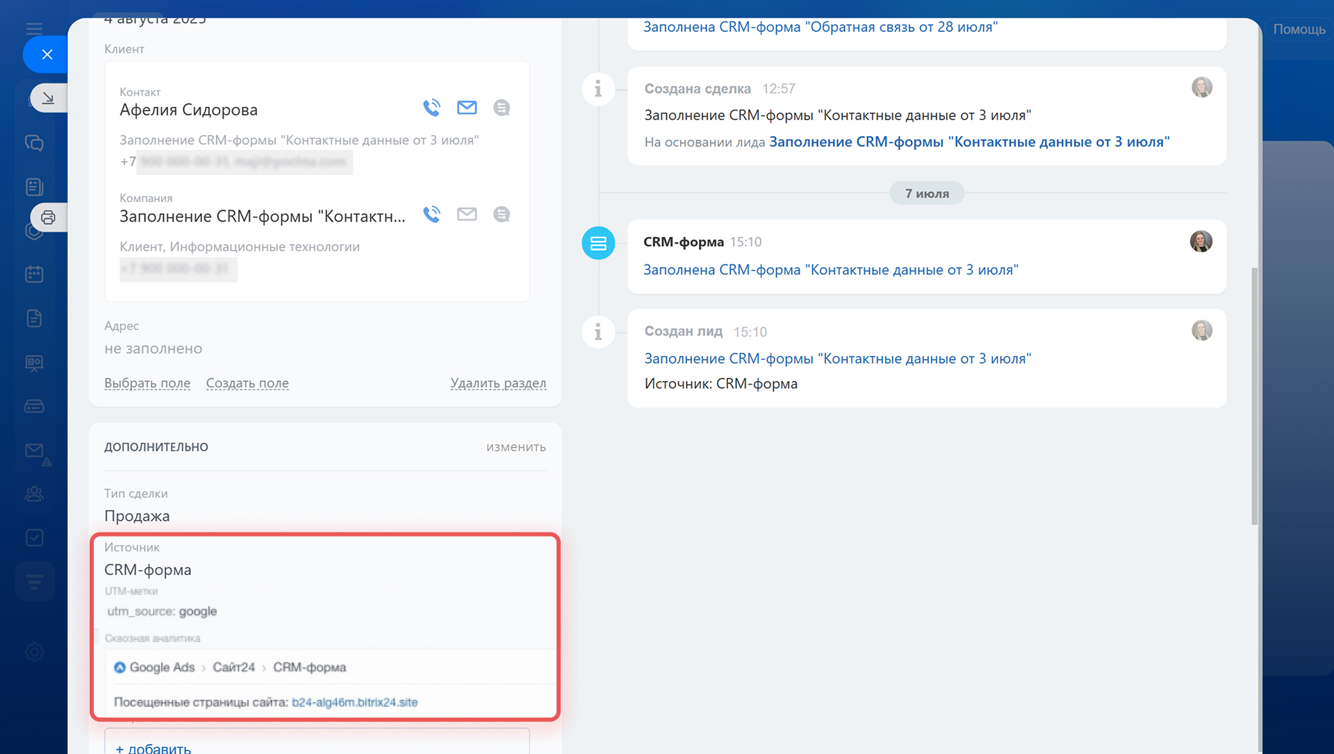 После этого в CRM появится сделка, в которой отображается информация об источнике и UTM-метка.