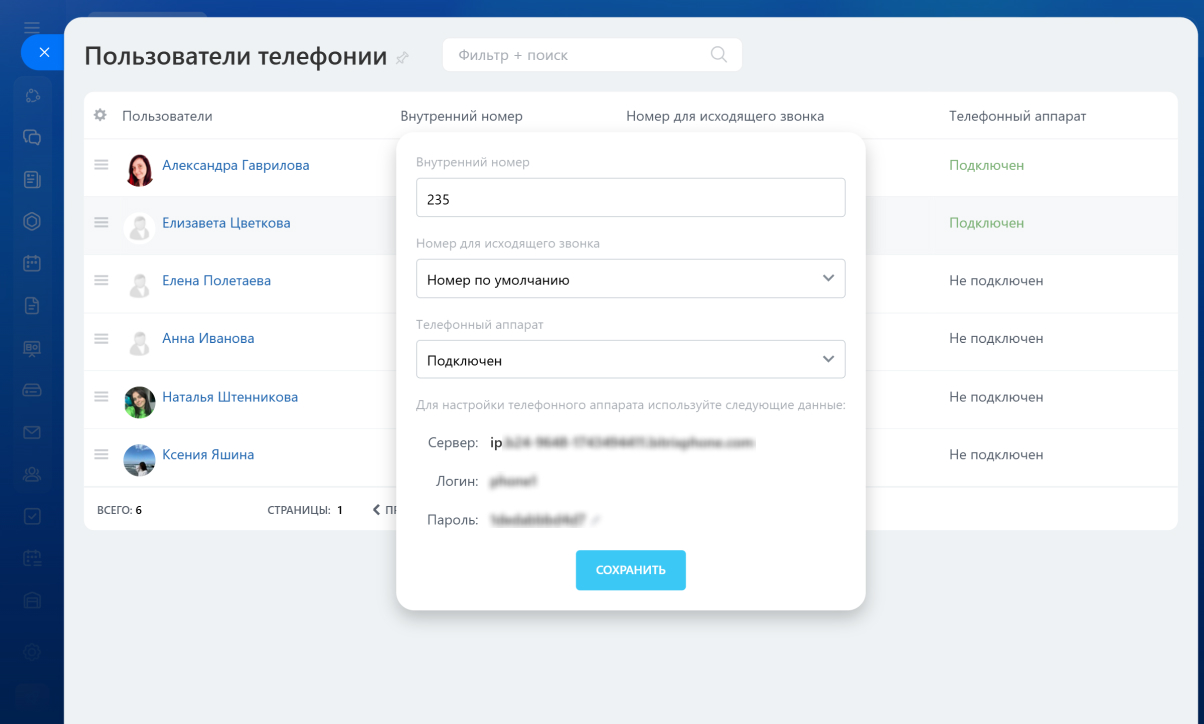 Для настройки телефонного аппарата используются данные карточки пользователя из раздела Телефония > Пользователи: