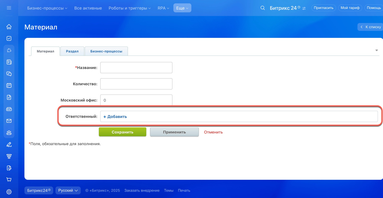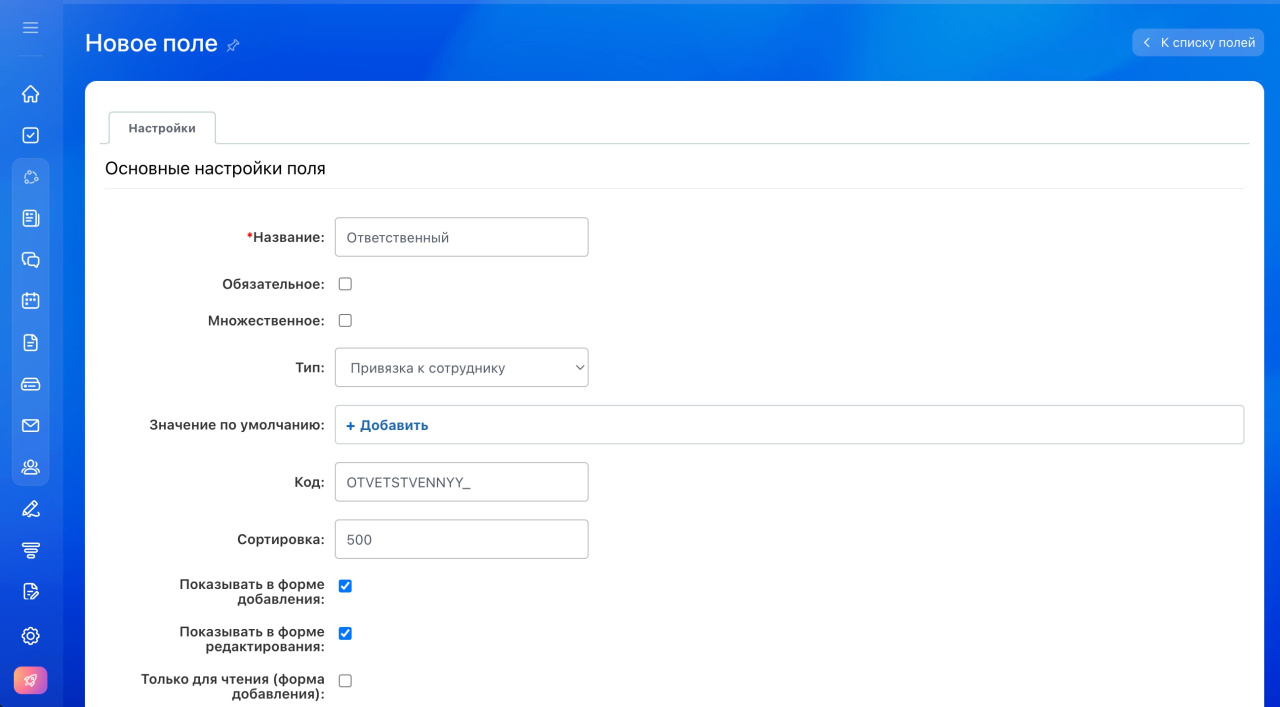 - Только для чтения (форма добавления) и Только для чтения (форма редактирования) - включите опцию, чтобы запретить редактировать поле при создании либо редактировании документа.