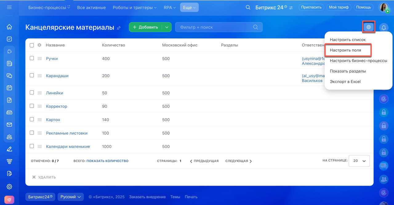Каждый элемент списка имеет собственные параметры. Например, при создании списка рекламных материалов мы должны указать, кто из сотрудников будет ответственным за каждый материал.