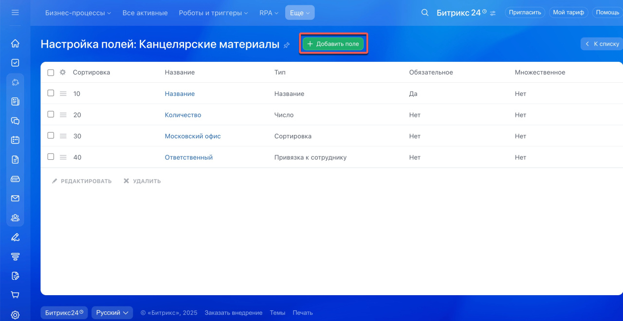 По умолчанию каждый список имеет только одно поле - Название. Нажмите Добавить поле, чтобы создать новое.