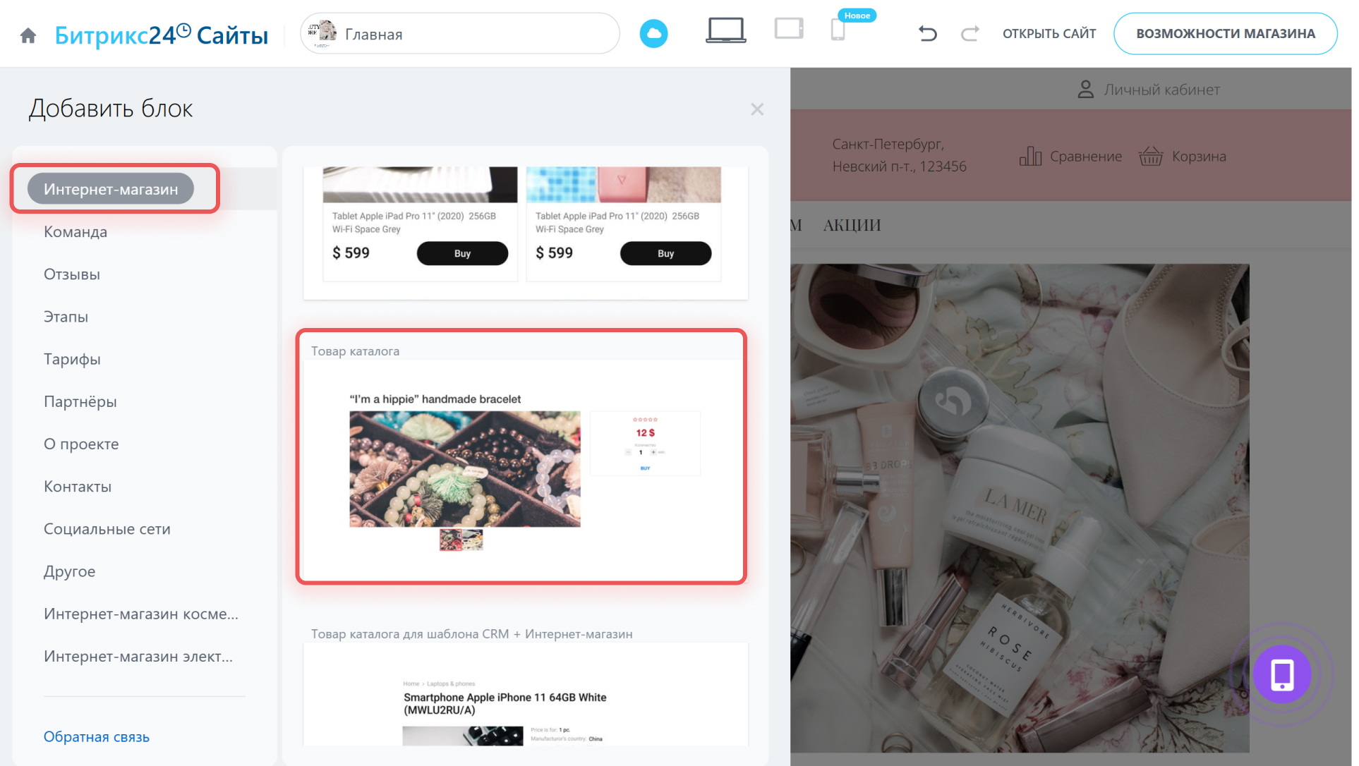Блок Товар каталога размещает на сайте детальную страницу одного товара. Рассмотрим настройки блока на примере. Создадим отдельную страницу для продажи товара по акции.