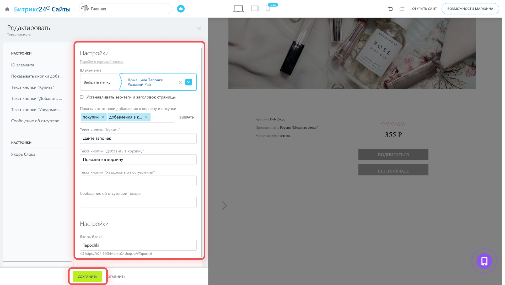 Откройте нужный товар в каталоге, нажмите Настроить напротив нужного поля, включите опцию Показывать в интернет-магазине и сохраните изменения.