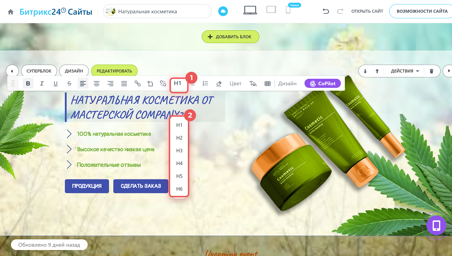 Для Битрикс24.Сайтов заголовки блоков указываются автоматически. Но заголовка H1 по умолчанию нет ни у одного блока. На странице не может быть более одного заголовка H1, поэтому вам нужно указать его вручную.